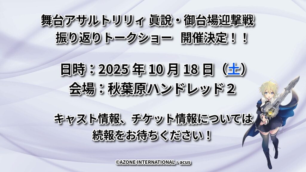 ・舞台「アサルトリリィ」-眞說・御台場迎撃戦-公演終演後に作品の振り返りや尾花沢先生の解説を合わせたトークイベントを予定しております。